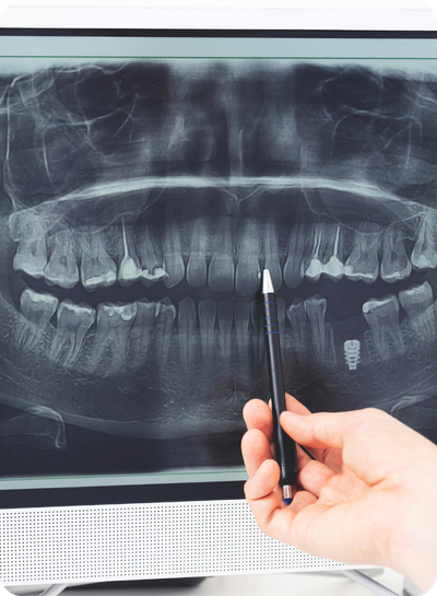 OPG je 2D rentgenový snímek celého chrupu, který umožňuje komplexní zobrazení zubů, čelistí a okolních kosti jedním snímkem.